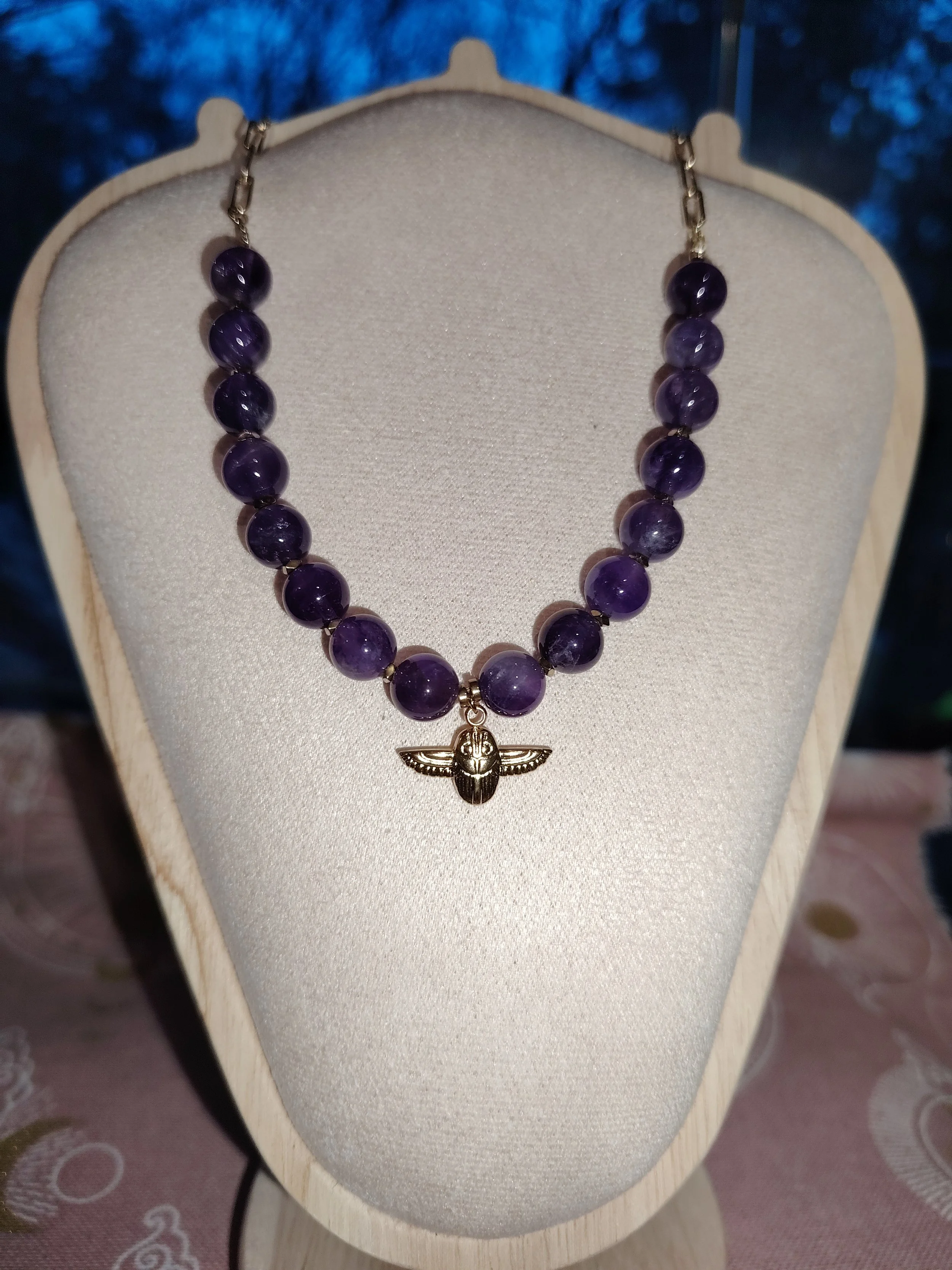 Ce collier en Améthystes naturelles est une invitation au voyage intérieur. Les perles violettes, profondes et lumineuses, forment un cercle harmonieux autour d’un scarabée sacré, symbole ancestral de renaissance, de protection et de transformation.